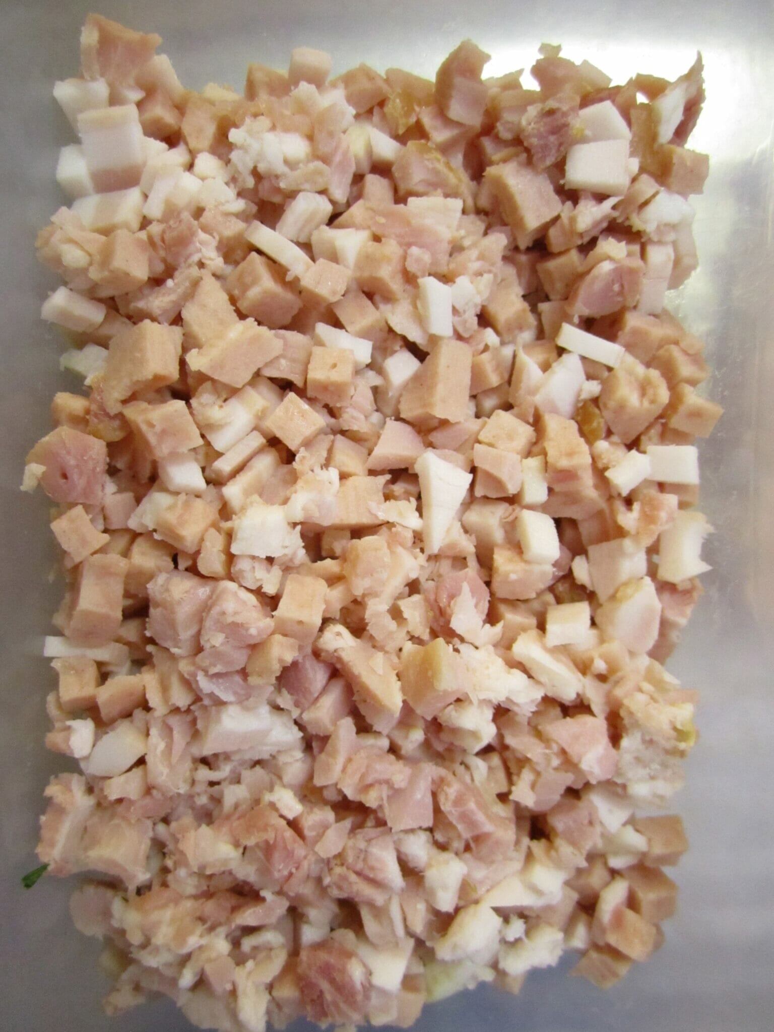 While the yeast is doing its work in the mixture, dice 750g/27 ounces of bacon pieces into small squares. I have found that using a Nutribullet to quickly (1-2 seconds) dice the bacon works well and is quicker than cutting with a knife.